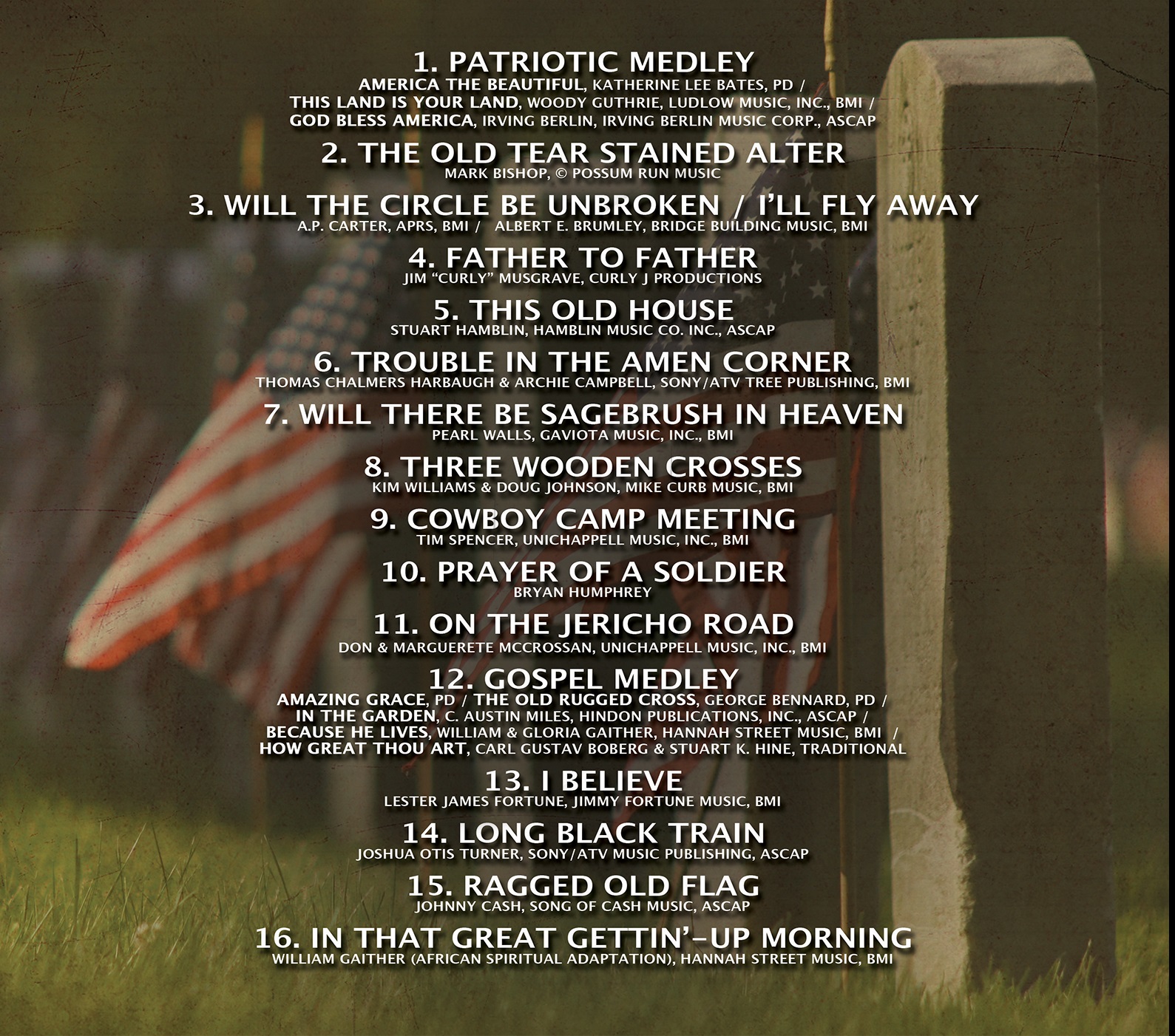 Patriotic Medley: America the Beautiful, This Land is Your Land, God Bless America The Old Tear Stained Altar Will the Circle be Unbroken/I'll Fly Away Father to Father This Old House Trouble in the Amen Corner Will there be Sagebrush in Heaven Three Wooden Crosses Cowboy Camp Meeting Prayer of a Soldier On the Jericho Road Gospel Medley: Amazing Grace, The Old Rugged Cross, In the Garden, Because He Lives, How Great Thou Art I Believe Long Black Train Ragged Old Flag In That Great Gettin' Up Morning